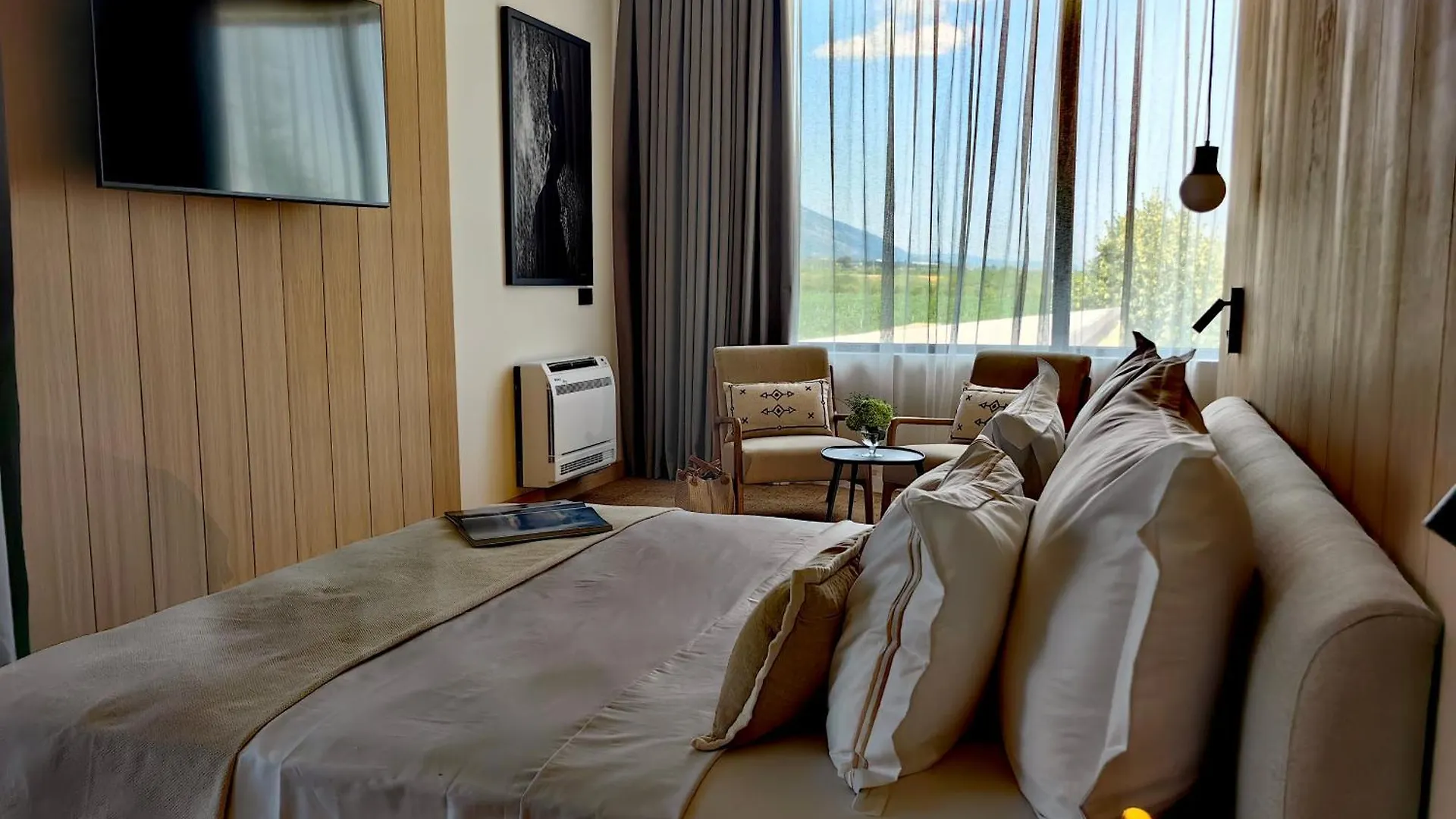 The en suite rooms include climate control, as well as attached bathrooms with such comforts as towels and slippers. Guests can take advantage of views of the mountain.